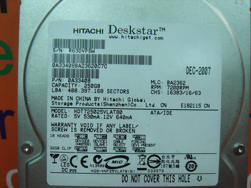 HITACHI HDT725025VLAT80 PN:0A33408 250GB IDE