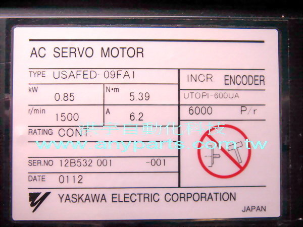 型號 : YASKAWA AC SERVO MOTOR USAFED-09FA1 0.85kW 6.2A / ENCODER UTOPI-600UA