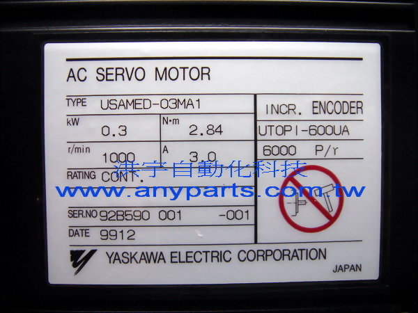 型號 : YASKAWA AC SERVO MOTOR USAMED-03MA1 0.3kW 3.0A / ENCODER UTOPI-600UA